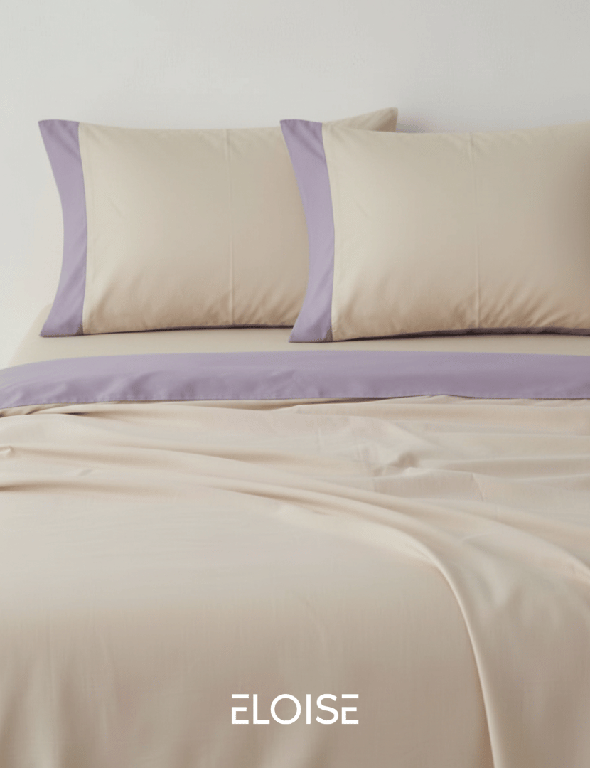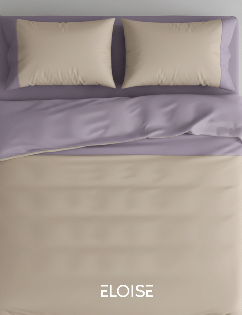 Our Eloise “Out and above” bedding is made from 100% cotton for a soft and comfortable feel. This set features a lavender purple and light beige color scheme. Each package includes one flat sheet and two matching pillowcases. It is a simple, high-quality choice for your bedroom.